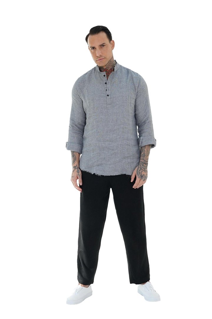 Ανανεώστε το καθημερινό σας στυλ με αυτό το μακρυμάνικο πουκάμισο από μείγμα λινών. Με διακριτικό γιακά χωρίς πέτο (band collar) και κουμπιά στο μπροστινό μέρος, συνδυάζει άνεση και ανεπιτήδευτη κομψότητα. Το ύφασμα σε γκρι απόχρωση με φυσική υφή προσφέρει δροσερή αίσθηση και casual αισθητική – ιδανικό για καλοκαιρινές εμφανίσεις με χαρακτήρα.
